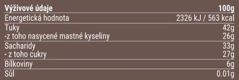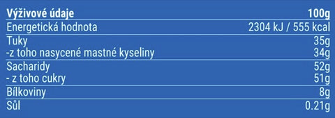 Výživové údaje 100g: Energetická hodnota: 2227kJ / 533kcal, Tuky: 30g, - z toho nasycené mastné kyseliny: 30g, Sacharidy: 58g, - z toho cukry: 51g, Bílkoviny: 9g, Sůl: 0,08g