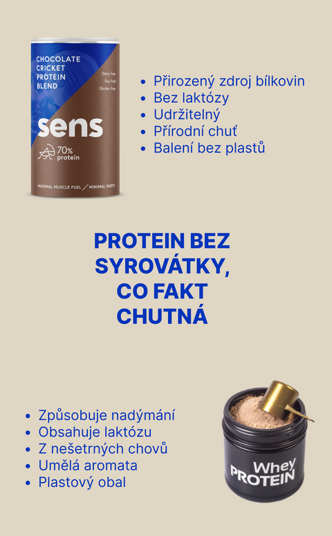Standardní proteinové mixy obsahují plno nekvalitních a umělých přísad. Jako zdroj proteinu využívají syrovátku, která pochází z mléka z velkochovů a často obsahuje různá pochybná rezidua. Mnoho lidí má problém syrovátku strávit, což má za následek nepříjemné nadýmání a plynatost. Rostlinné proteiny zase neobsahují ideální spektrum aminokyselin a navíc v sobě nemají přirozeně žádné mikroživiny navíc. Sens čokoládový proteinový mix je perfektní kombinací rostlinného a živočišného proteinu s optimálním spektrem aminokyselin. Je dobře stravitelný a cvrččí protein je navíc bohatým zdrojem vlákniny, vitamínu B12 a železa.